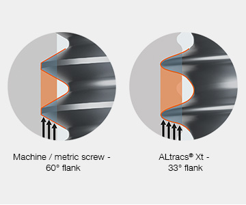 Due to the specific thread design for the use in light alloys ALtracs® Xt achieves unique features. The circular cross-section of the thread creates maximum thread engagement in each thread pitch. Furthermore, the reduced flank angle of 33° (compared to a 60° flank of a standard fastener) enables ALtracs® Xt to geometrically strengthen the light alloy part of the thread.
